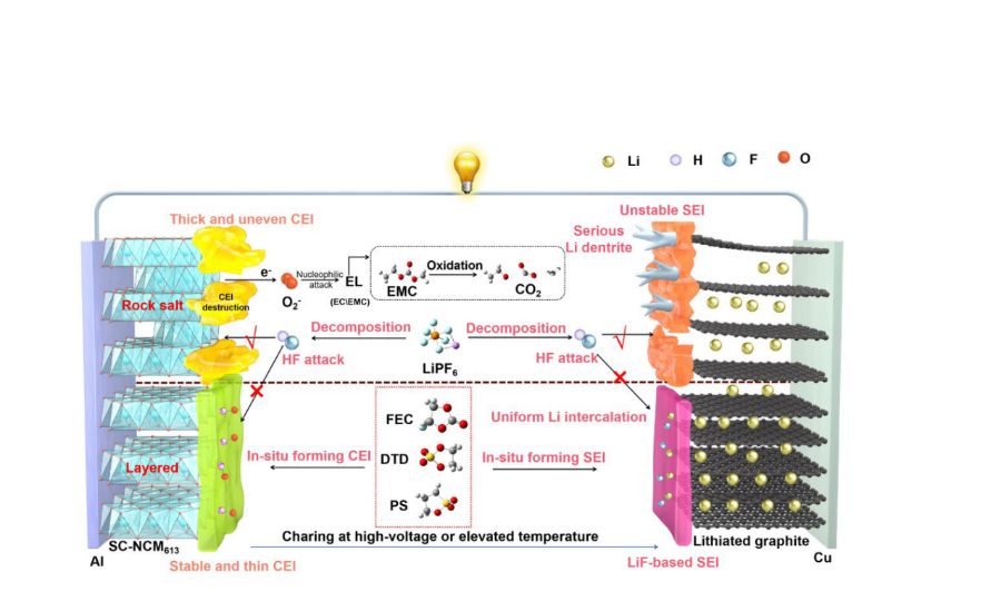 众所周知,传统电解液在高电压(≥4.4V)和高温条件下易发生电化学氧化而不稳定,大大降低了电池实际性能,限制了其应用。该研究通过在商业化碳酸酯基电解液中添加微量氟代碳酸乙烯酯(FEC)、硫酸乙烯酯(DTD)和丙烷磺酸内酯(PS)形成FDP电解液并组装全电池,通过循环前后表征实验与理论计算的结合清晰揭示了溶剂分子与FDP添加剂在电极表面形成较稳定的界面保护层。因此,在严格工作环境(如高温、高电压等)下,所组装的1.7 Ah级LiNi0.6Co0.1Mn0.3O2(SC-NCM613)ǁ石墨软包全电池能显著提升循环容量保持率,为锂离子电池在复杂工况下的应用提供有力支撑。(一审 易姣 二审 杨静 三审 袁勇军)