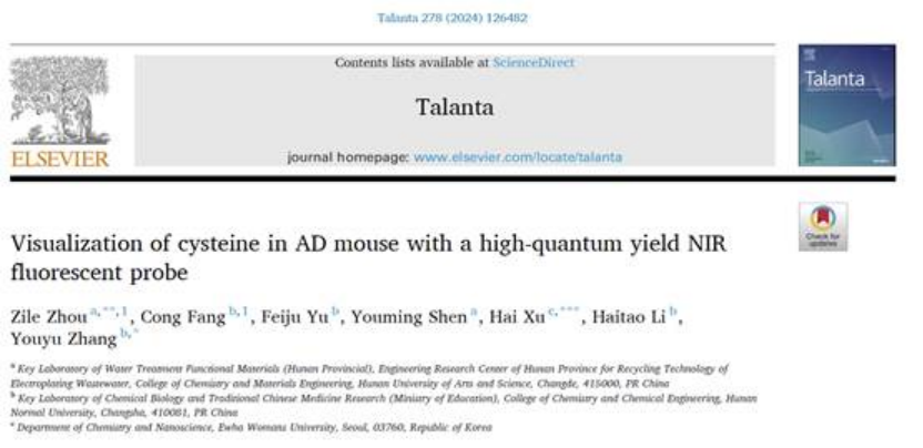 2024年5月12日,化学与材料工程学院周紫乐老师,以第一作者的身份在国际著名的分析化学综合性期刊《Talanta》(SCI JCRQ1/中科院一区,2023-2024最新影响因子为5.6),发表了题为“Visualization of cysteine in AD mouse with a high-quantum yield NIR fluorescent probe”的研究论文。该研究论文报道了一种近红外荧光探针用于生物体系中半胱氨酸(Cys)的成像,阐明了阿尔茨海默病与Cys浓度之间的相关性,对于阿尔茨海默病的发病机制研究具有重要意义。
