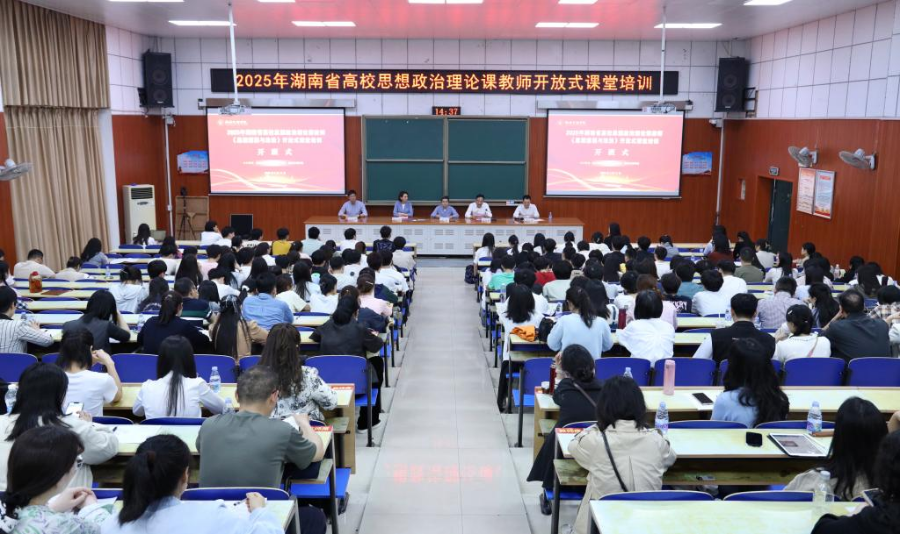 本网讯(马克思主义学院 供稿)4月11日下午,由湖南省教育厅主办的2025年湖南省高校思想政治理论课教师开放式课堂《思想道德与法治》专场培训在我校举行。湖南省委教育工委宣传部副部长、省教育厅思政处副处长尹怡,我校党委副书记李红革出席开班仪式,来自全省各高校的130多位思政课老师参加培训。我校马克思主义学院院长周忠华主持开班式。