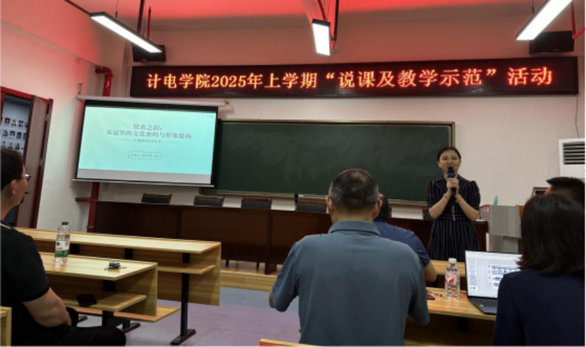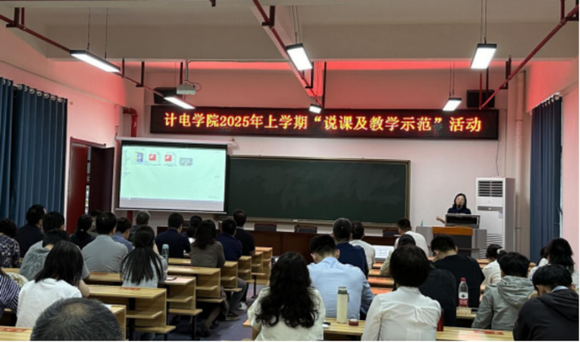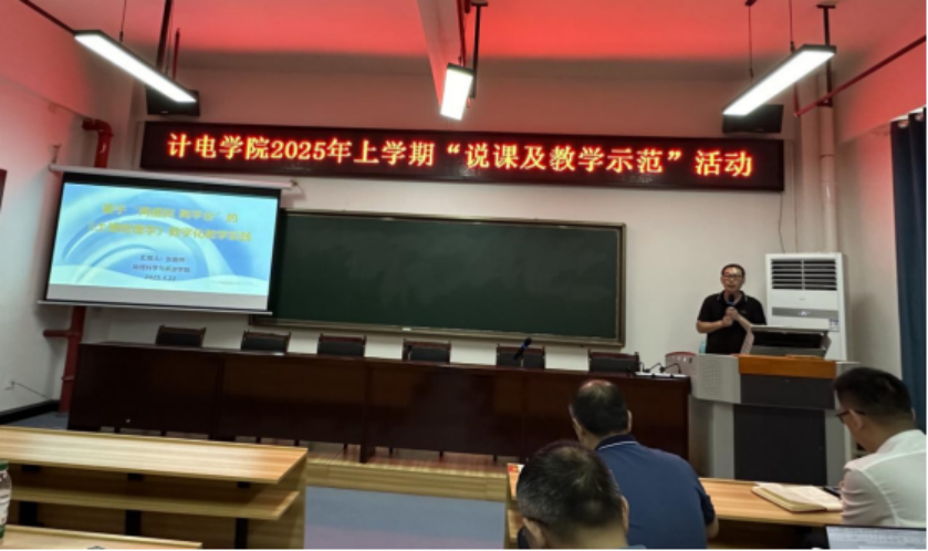 (张君梅、谭文学)为提升教师教学能力和水平,促进教学经验交流与共享,计电学院于2025年4月22日在实训楼B803举办以“说课示范”和“教学竞赛展示示范”为主题的教研活动,邀请数理学院黎小琴教授、地旅学院王敏博士、张鹏钾博士开展教学分享,活动由副院长谭文学主持,学院领导班子及全体任课老师参加活动。