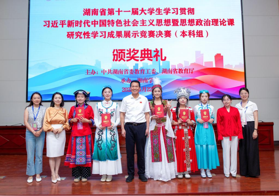 本网讯(马克思主义学院 供稿)5月22日,湖南省第十一届大学生学习贯彻习近平新时代中国特色社会主义思想暨思想政治理论课研究性学习成果展示竞赛决赛及颁奖典礼在郴州举行。我校师生在决赛中表现优秀,荣获一等奖1项、二等奖3项、三等奖1项,实现了我校在该项重要赛事上的历史性突破。此次竞赛的优秀作品将纳入省级思政课案例库。