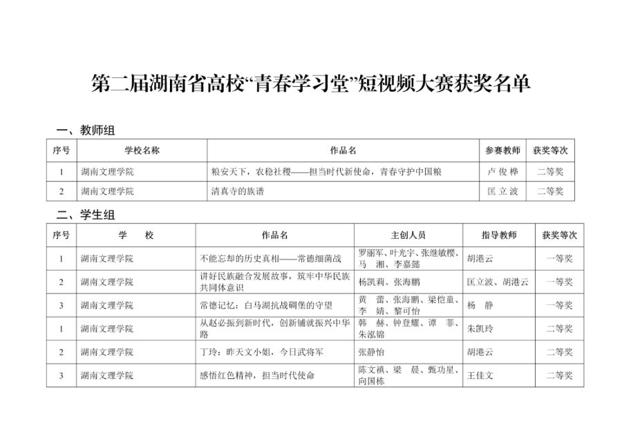 本网讯(文字 郭东林)近日,中共湖南省委教育工委、湖南省教育厅公布了第二届湖南省高校“青春学习堂”短视频大赛评选结果,我校荣获优秀组织奖,教师组摘得二等奖2项,学生组摘得一等奖3项、二等奖5项、三等奖8项。